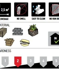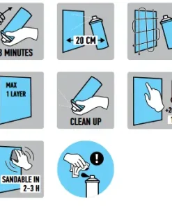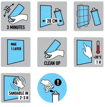 HOW TO USE: Prepare the surface by sanding accordingly. Use only on a dry and thoroughly cleaned surface. Paint one layer and let dry for 2-3 hours. If desired, sand with 320/400/800 sandpaper. Coverage 2.5 m² Drying time:1h. Sandable 2-3h. Always clean hands with water after use.