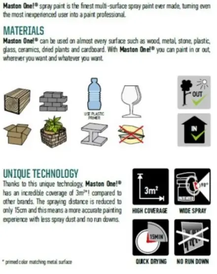 Maston One® spray paint is the finest multi-surface spray paint ever made, turning even the most inexperienced user into a paint professional. Maston One® acryl paint can be used on almost every surface such as wood, metal, stone, plastic, glass, ceramics, dried plants and cardboard. In the One® spray paint range, is everything you need: primers, topcoats, lacquers in all finishes and top coats in several different color options. The paint has excellent adhesion.