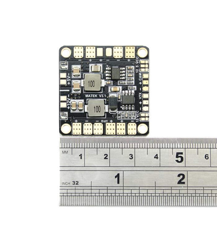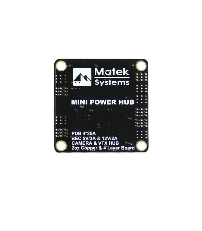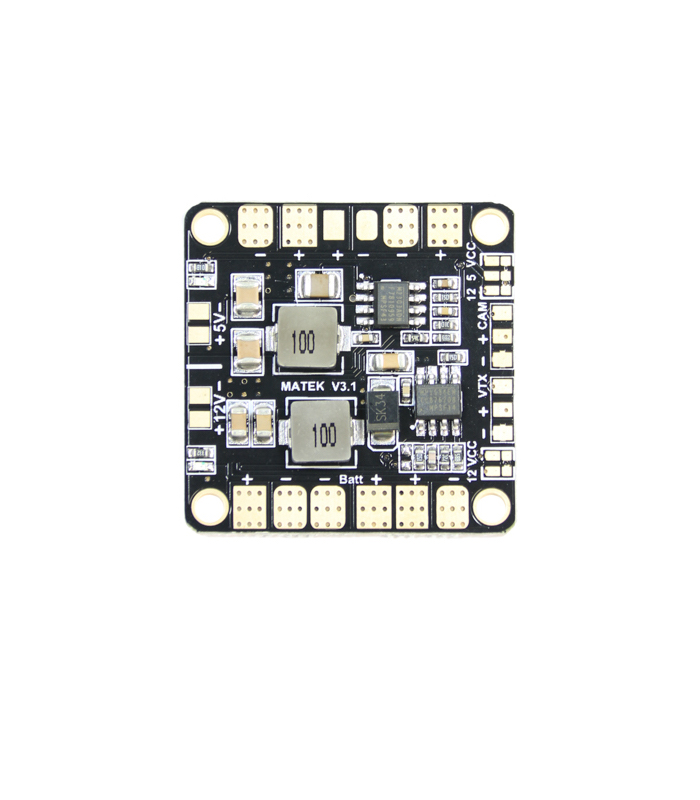 Matek’s mini power distribution board (PDB) has been engineered to provide the highest possible performance and reliability in a 36*36mm, 4 layered PCB. The power hub distributes power from a battery pack to 4 ESCs, as well as providing regulated 5 and 12 volt DC power outputs for powering electronics such as a flight controller, camera, servos, video transmitter, LEDs, etc. Both BECs are compatible with 2-6S LiPo. The 5V BEC is rated at 3amps continuous and the 12V BEC can provide 2 amps continuous. The board has dedicated connections for a FPV camera and a FPV video transmitter (VTX), with solder jumpers that let you select their output voltage (5/12v). So you can use a 5v camera with a 12v VTX, or a 12v camera with a 12v VTX. The board is a standard 36mm sized PDB, so you can stack it cleanly with the CC3D, Naze and most other board type flight controllers. If you require a smaller PDB, Matek’s micro PDB has all the functions of this PDB, except for the dedicated FPV connections.
