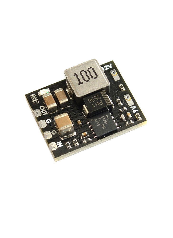 The Matek Micro BEC 6-60V is a syncronous step-down converter with selectable 5V, 9V or 12V output (default 5V). The voltage output of this BEC is selected by a simple solder tab; by default it is set to output 5 volts.The Matek Micro BEC is rated for 1.3A-2.8A continuous current depending on input/output voltage.