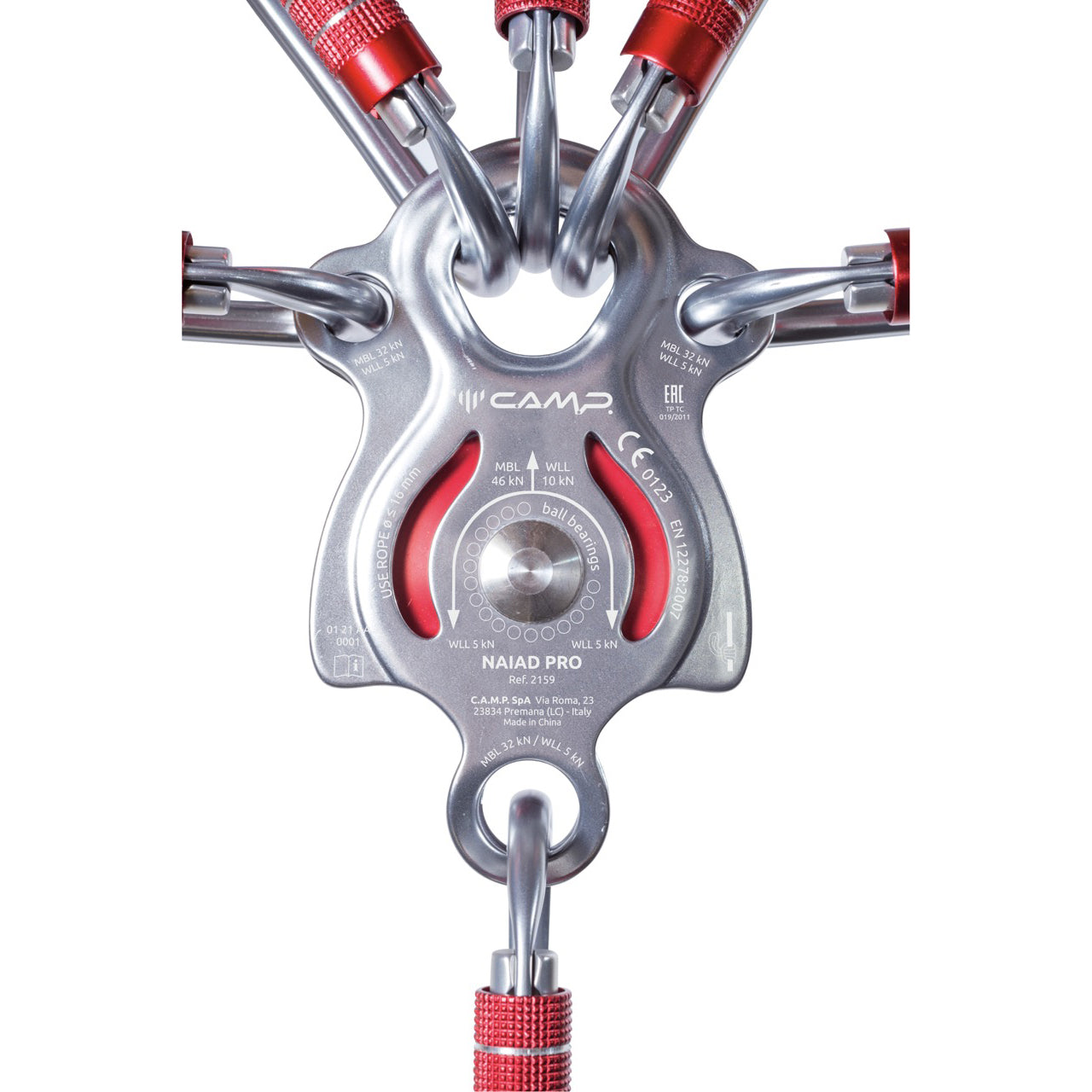 A high-strength, multifunctional pulley featuring a large sheave for high efficiency. The Naiad Pro is ideal for high load haul systems and complex operations. It uses the same design as the Naiad with a main attachment hole that accommodates three carabiners, two secondary holes on the sides for positioning and a large lower becket hole, but