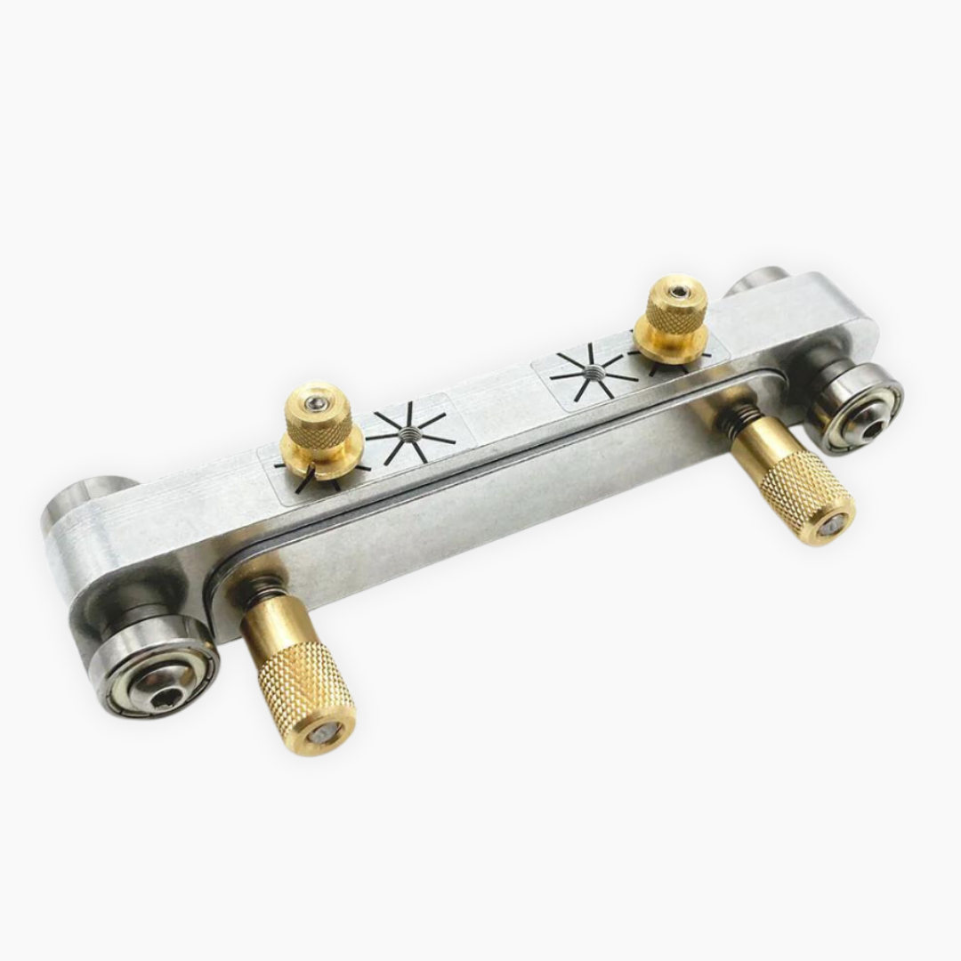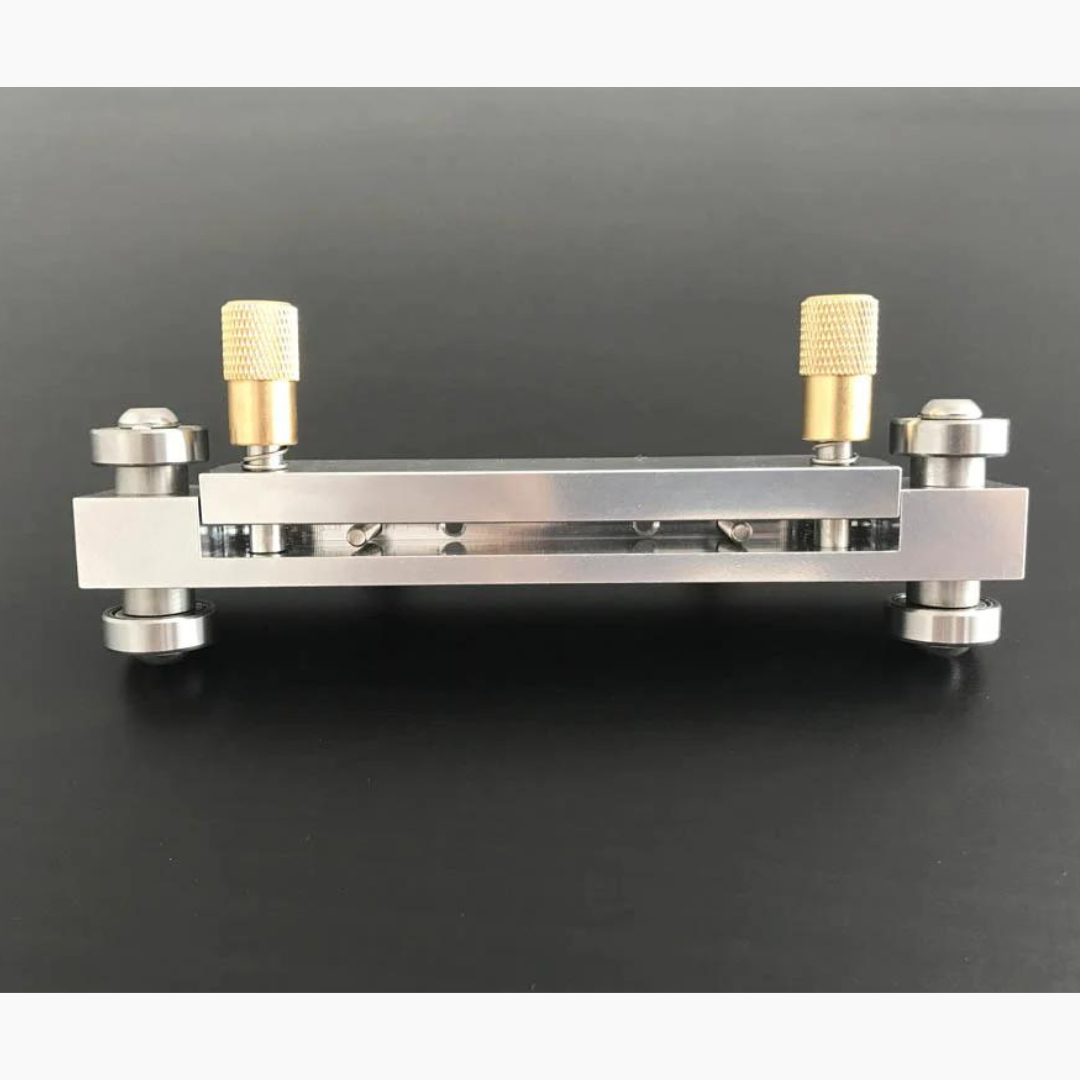 A squared bottom is always important for the nut and saddle. It can be difficult to keep the nuts or saddles vertical when sanding them by hand, and the poor fit can affect you overall tonal transfer. This nut and saddle sander is a perfect tool to square the bottoms of both nuts and saddles easily and fast! Simply put a nut or saddle inside the device and adjust the screws to set appropriate depth of material you’d like sanded, and sand it on a flat surface with a sandpaper. In seconds you get the piece squared and flat! This item is made of aluminum with brass parts and steel ball bearings, can accept material that is up to 87mm thick.