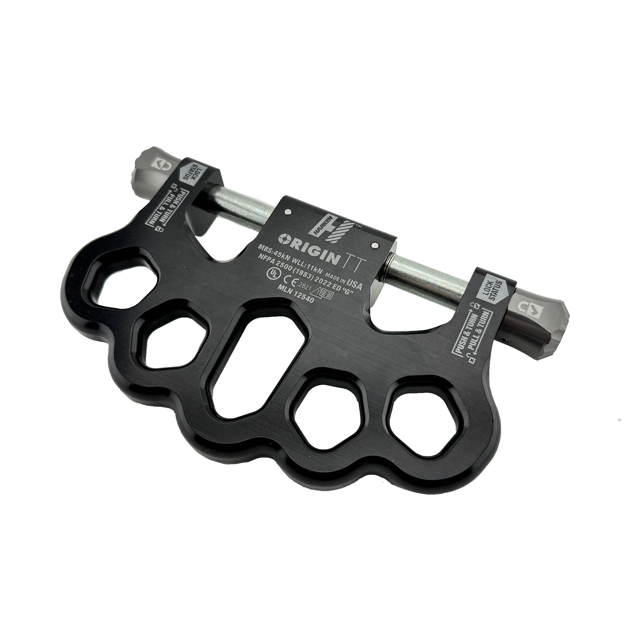 Eliminating carabiners also removes play in the system that can diminish coordination between the two lowering devices which remain immediately adjacent and aligned. This facilitates the coordinated precision that results from the dual-handled operation (Sharkfinning) where Origin TT excels. Lowering happens at the same pace on each device, greatly diminishing uncomfortable jerking for the humans at the end of the line. The connected devices stay better synchronized and better aligned with the load on hauls which become more efficient as well. NFPA 2500 (1983) 2022 ED “G”