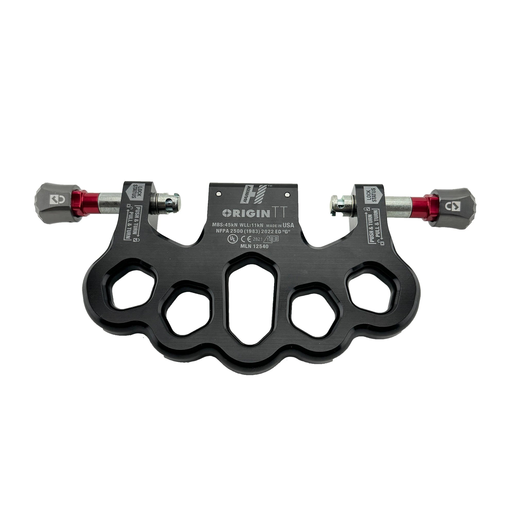 Unlike rigging plates that use a single bolt system to mount two side-by-side multi-purpose devices, Origin TT employs two quick-release locking pins. This enables independent attention to either of the twin devices managing ropes in the system, while the other remains safely tensioned. And set-up is simply easier.