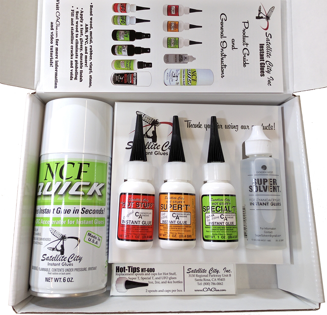 The Hot Stuff Pro Kit is perfect when you don’t need a lot of glue but you do need the ability to make different types of bonds. The kit comes with one 1oz bottle of Hot Stuff, Super T, and Special T as well as a 6oz NCF Quick aerosol accelerator, a 2oz bottle of debonder, and two extra spouts and overcaps. With this kit, you are prepared for nearly any bond.