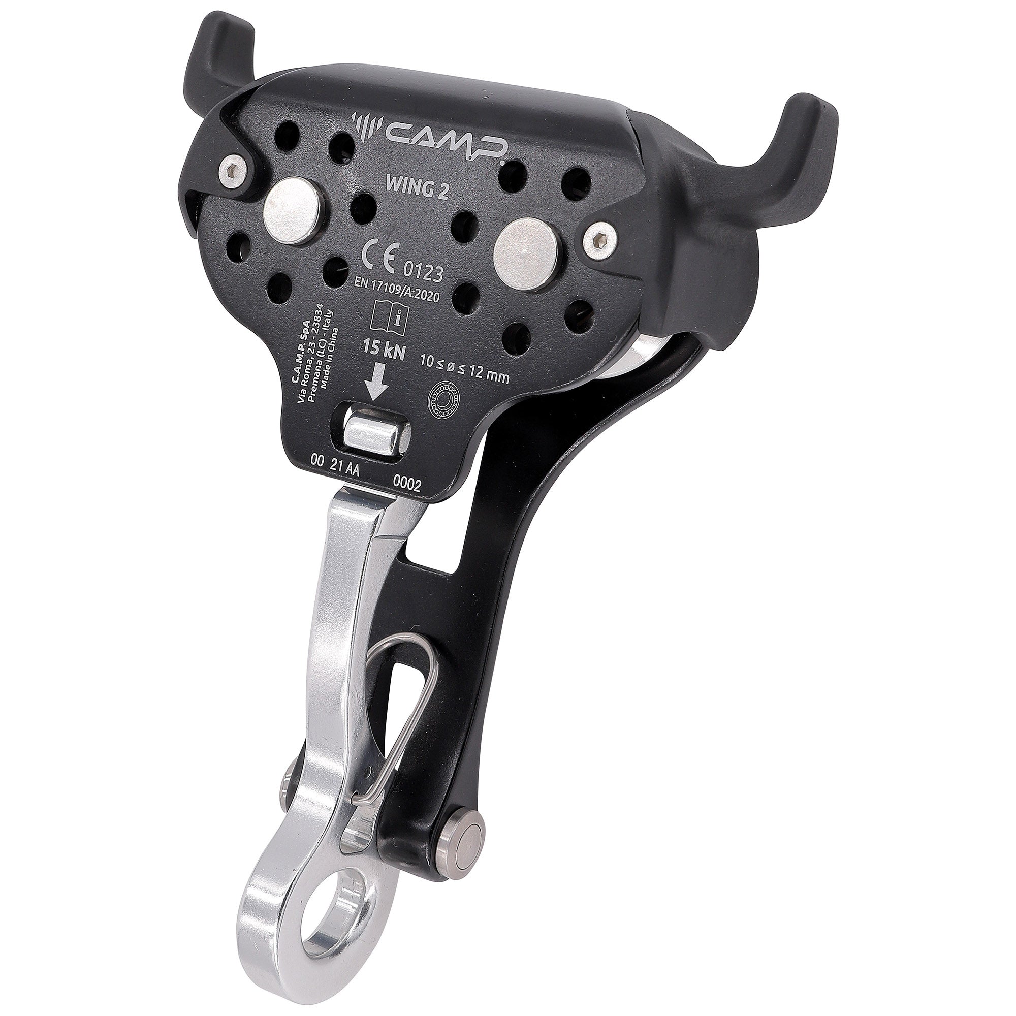 The Wing introduces a new level of safety to zip lines with an elegant pivot locking mechanism. This system makes attaching participants to cable or rope faster and easier. It also ensures that the pulley cannot detach from the line while it is loaded. Features efficient steel bearings for high-speed adventure and stainless steel sheaves for durability. Thermoplastic guards prevent accidental entanglement from clothing and hair and carry backup lines along with the pulley on upright prongs.