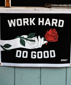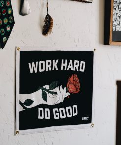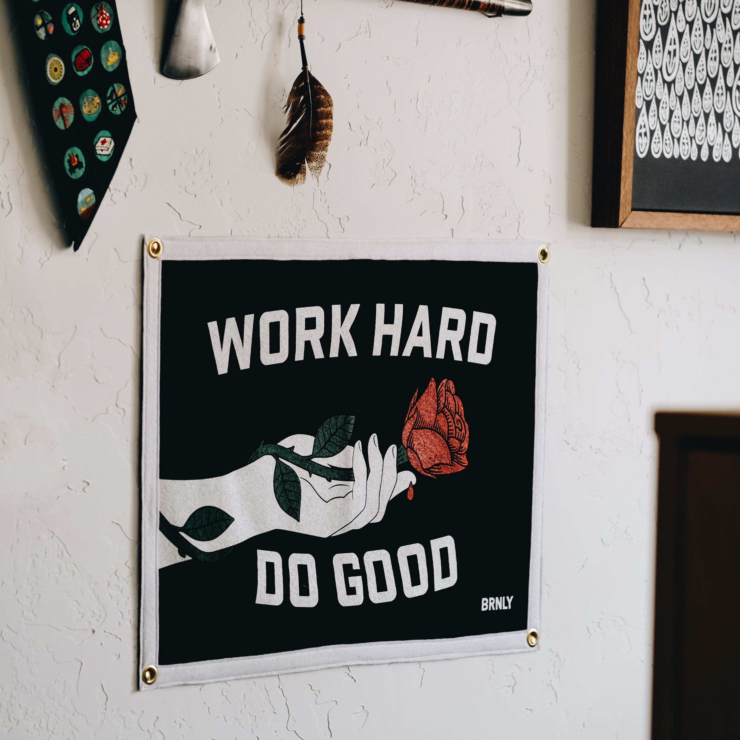 Hang one of our new Oxford Pennant Camp Flags wherever you want the reminder: Work Hard. Do Good.